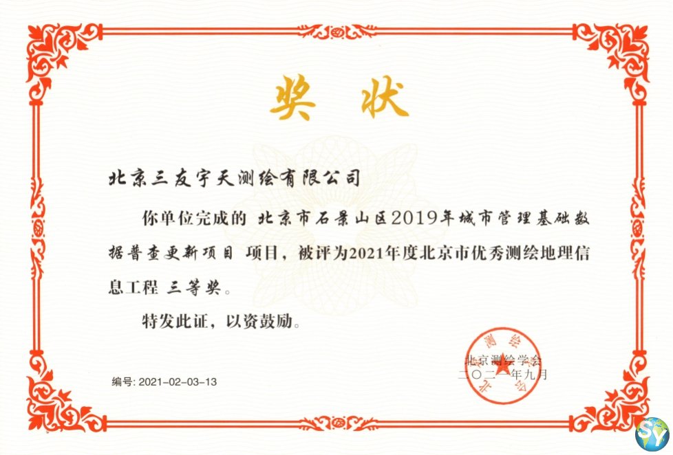 近日,在北京测绘学会开展的2021年度“优秀测绘地理信息工程奖”、“北京测绘学会测绘科技进步奖”的评选活动公示中,我公司两个项目(“林州产业集聚区智能管理综合系统”“石景山区2019年城市管理基础数据普查更新”)分别获得北京测绘学会测绘科技进步二等奖和北京市优秀测绘地理信息工程三等奖。